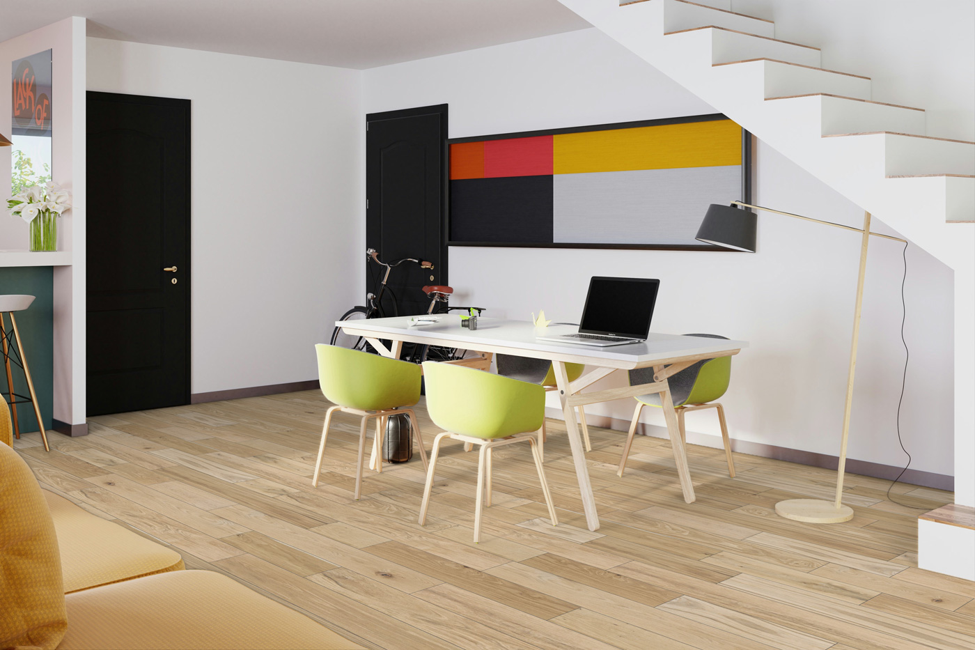Crafted from European Oak, this engineered hardwood features natural variation in color, grain, and texture. Each plank highlights the organic beauty and character of real wood.